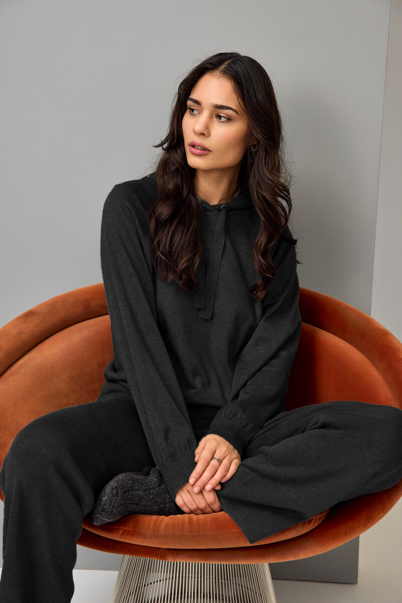 Mjög mjúk kósý peysa frá Jensen. Það er hetta og ermarnar eru vel víðar með stroffi neðst. Mikil teygja í efninu. Buxurnar eru einnig fáanlegar við. Virkilega flott og kósýlegt dress sem einnig er hægt að fá í brúnu.