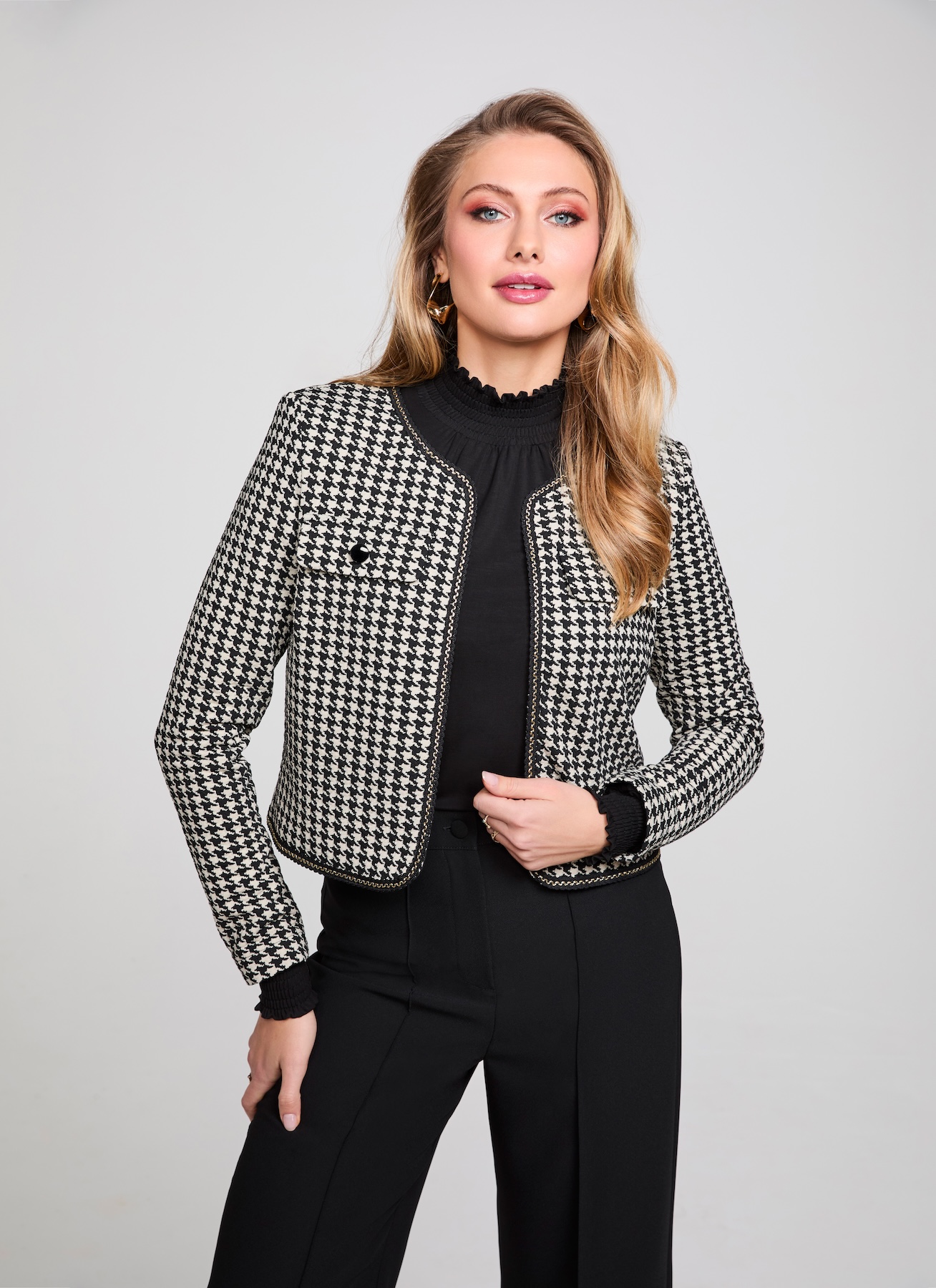 Mjög flottur jakki frá Tia. Jakkinn er frekar stuttur og opinn að framan með rúnað hálsmál, axlarpúða og vasalok með tölu að framan. Gylltur þráður er saumaður í kantana á jakkanum. Framhliðin er fóðruð. Mjög mjúkt og teygjanlegt efni. Þessi er ómissandi í fataskápinn.