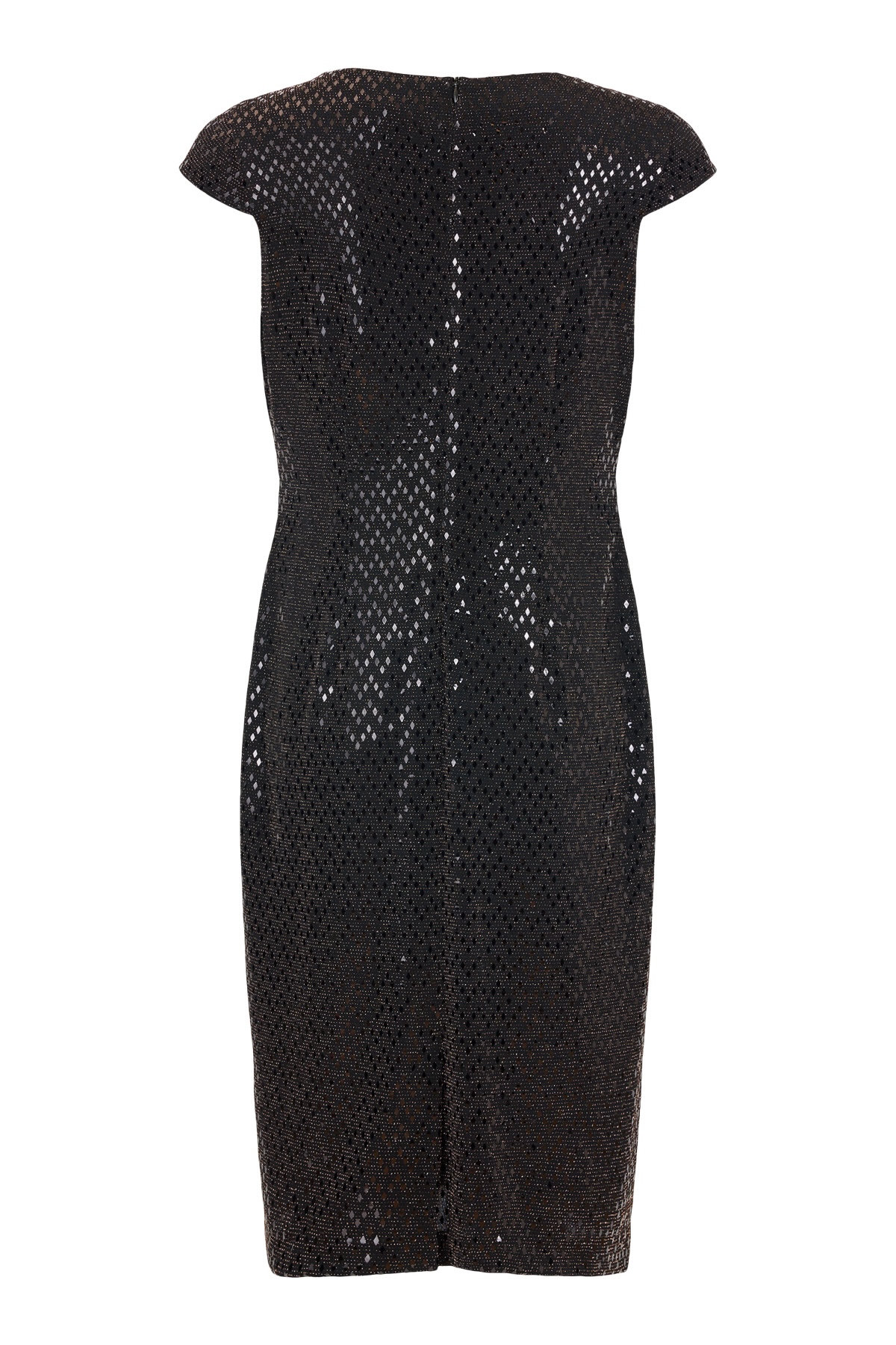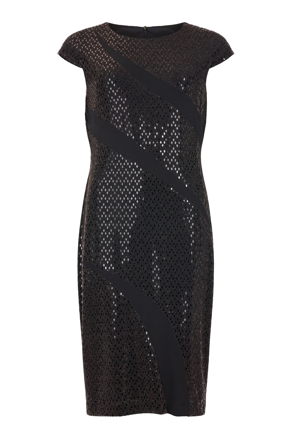 Fallegur kjóll frá Tia. Kjóllinn er tvöfaldur, aðsniðinn með klauf að aftan, rúnað hálsmál, ermalaus og rennilás að aftan. Gylltur þráður í efninu sem gefur kjólnum fallegt útlit. Mjög góð teygja í efninu. Virkilega flottur þessi.